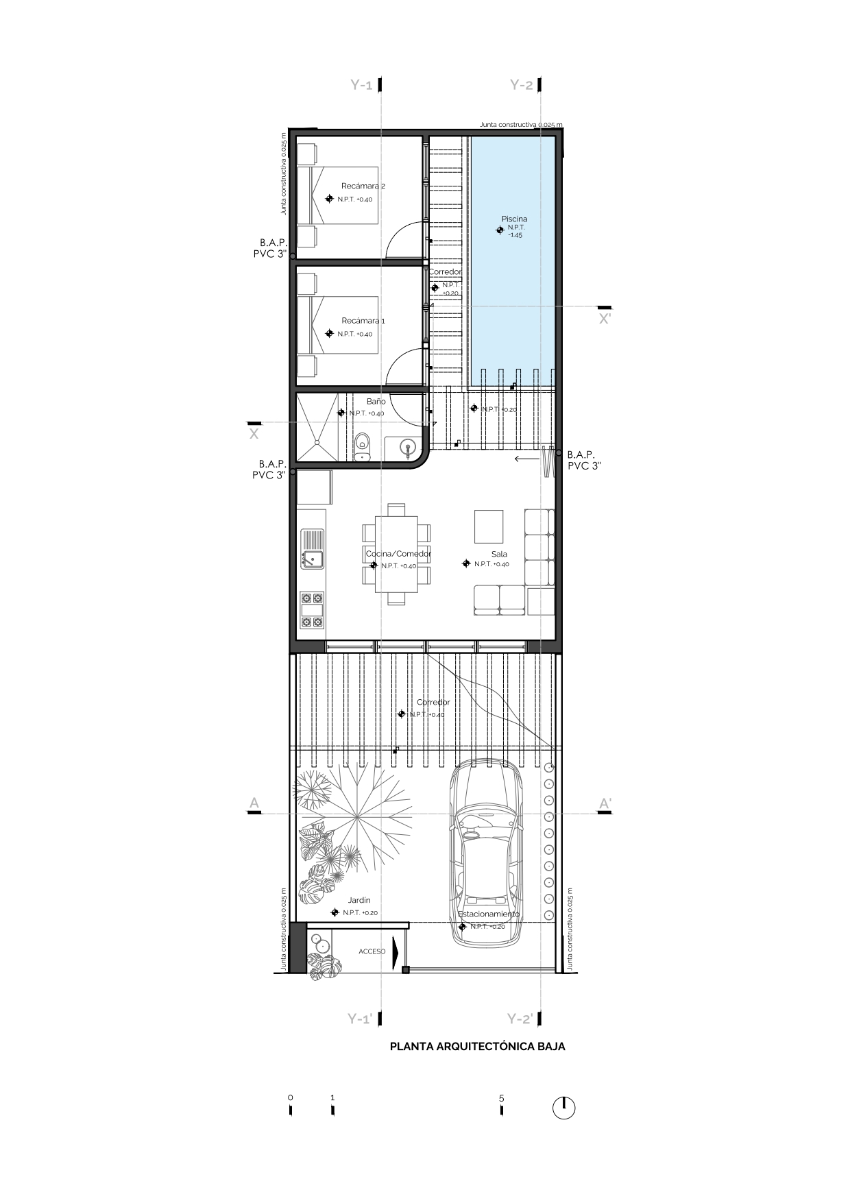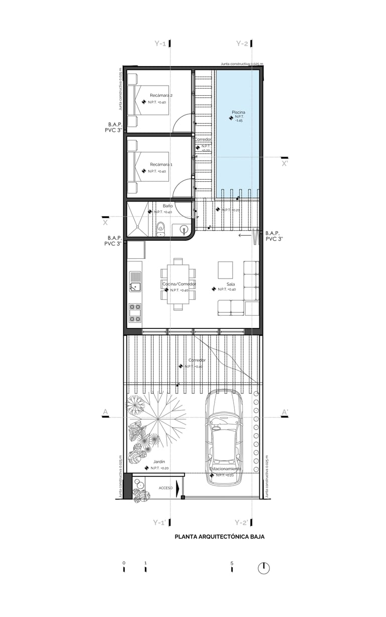 A pesar de desarrollarse en un terreno reducido, el proyecto logra una óptima distribución que aprovecha cada metro disponible. La organización de los espacios responde a un esquema funcional, donde las áreas comunes y privadas se integran de manera fluida.