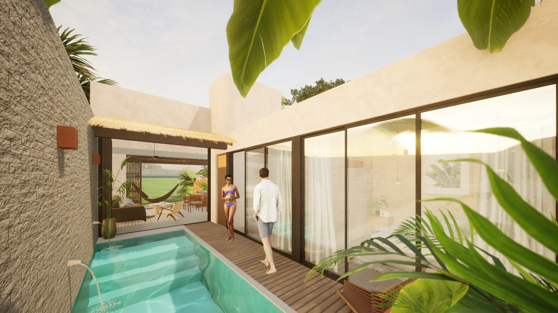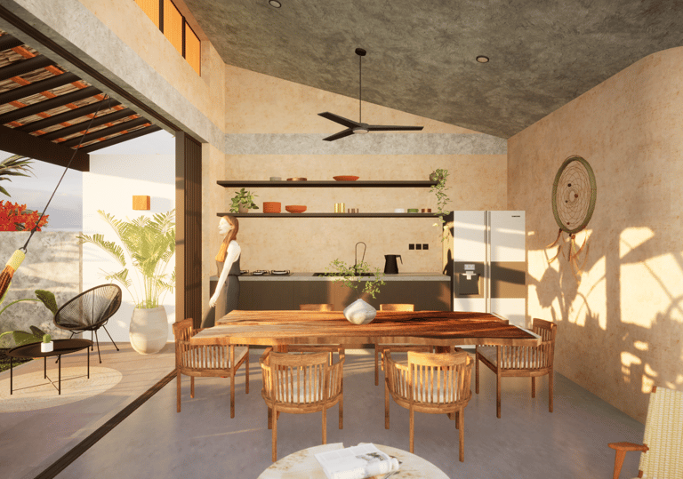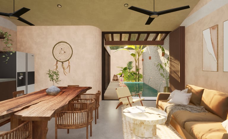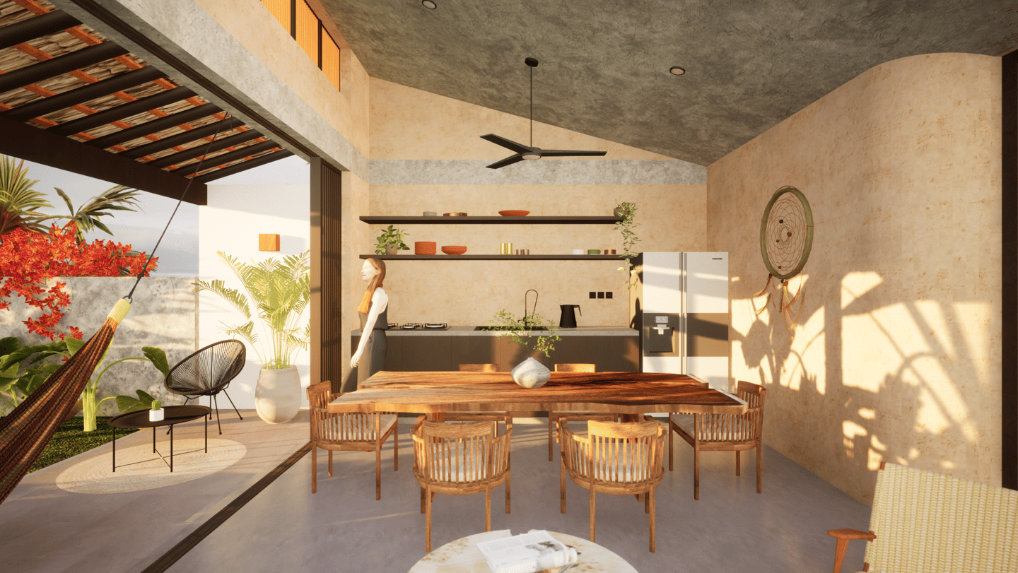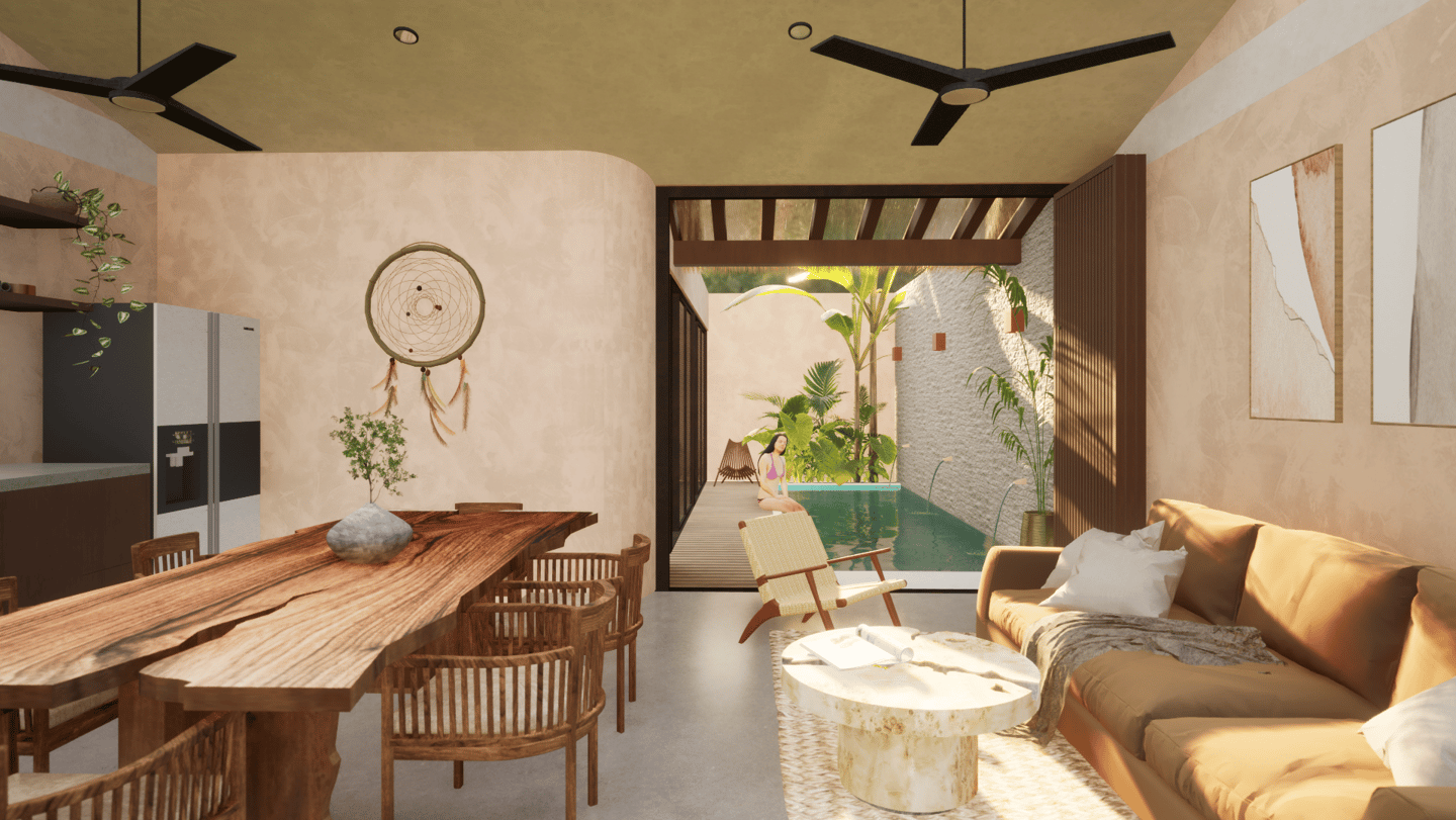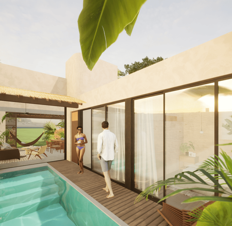 Como elemento central, una alberca interior ofrece un espacio de relajación y convivencia en perfecta sintonía con el estilo de vida de playa.