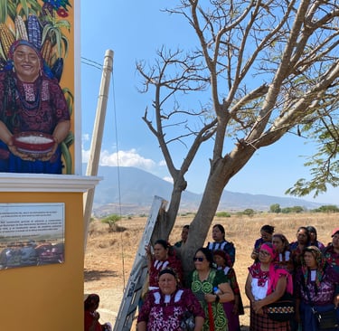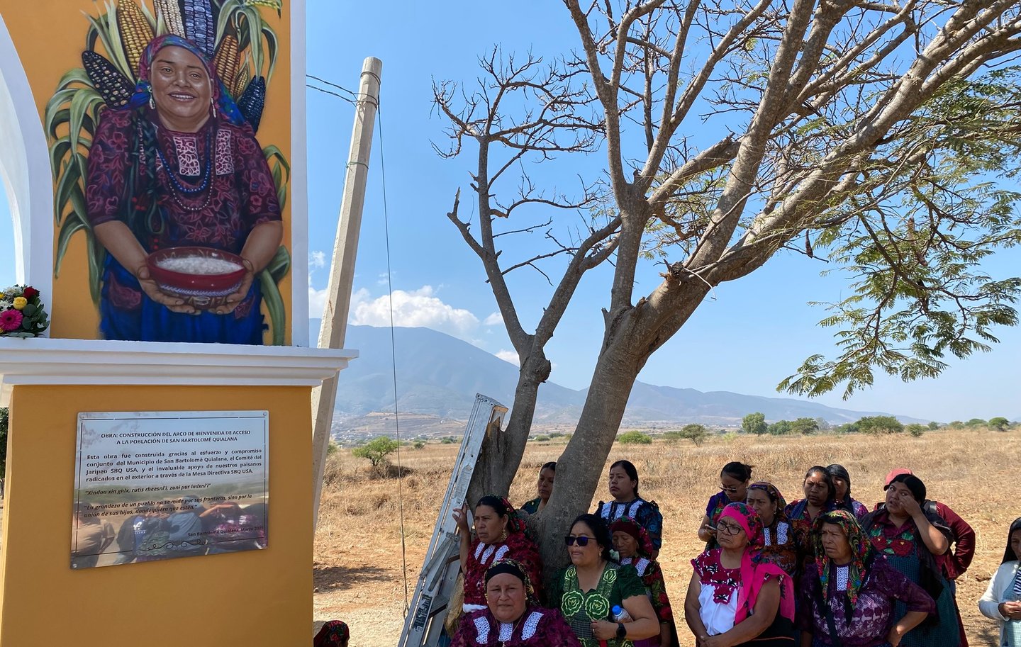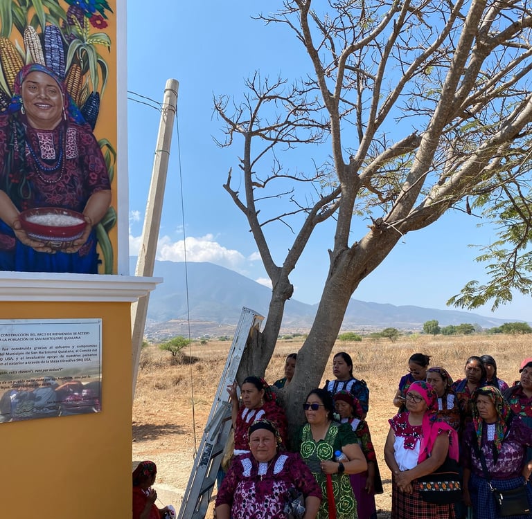 Mujeres de San Bartolomé Quialana junto al arco de bienvenida, 2024.