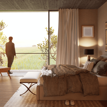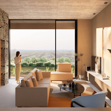 Su diseño arquitectónico aprovecha las vistas panorámicas y la serenidad del paisaje. Amplios ventanales permiten una generosa entrada de luz, creando espacios cálidos y acogedores.
